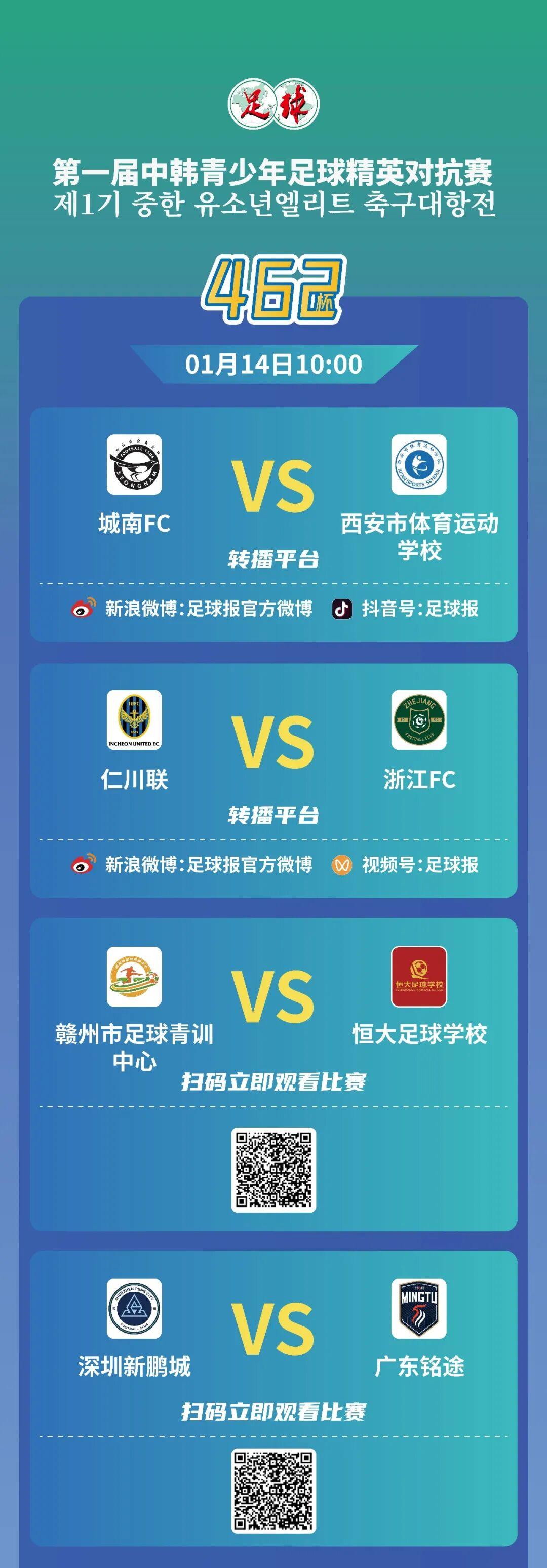 另外两场中韩对抗,城南FC对阵西安体校,龙仁FC对阵定南,两支韩国球队的实力都有较为明显的优势。此前3个比赛日每天都有中国球队击败韩国球队,今天这个希望恐怕还是要更多落在上海海港和浙江队身上。